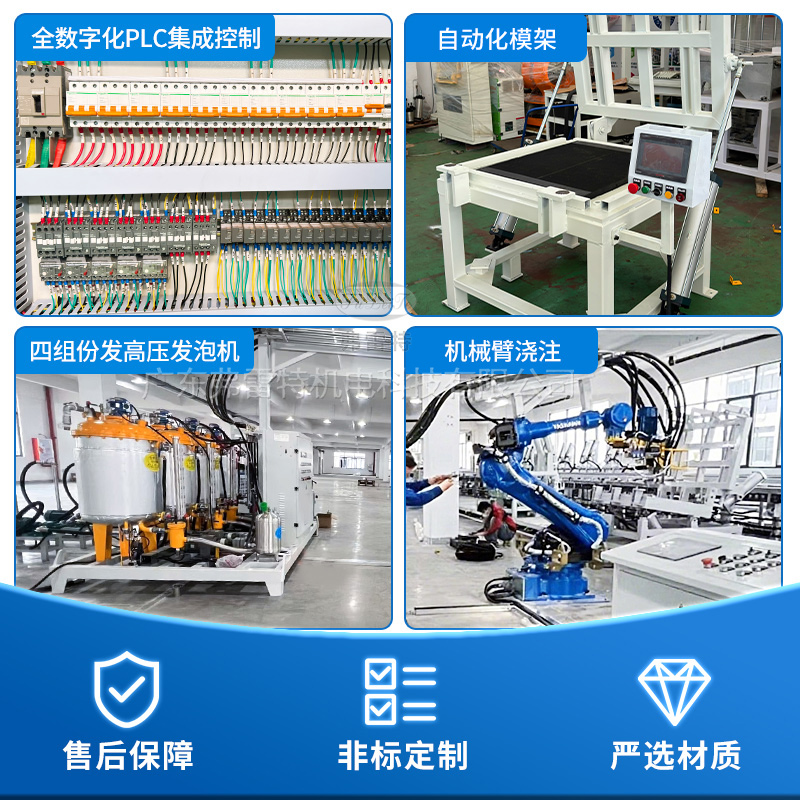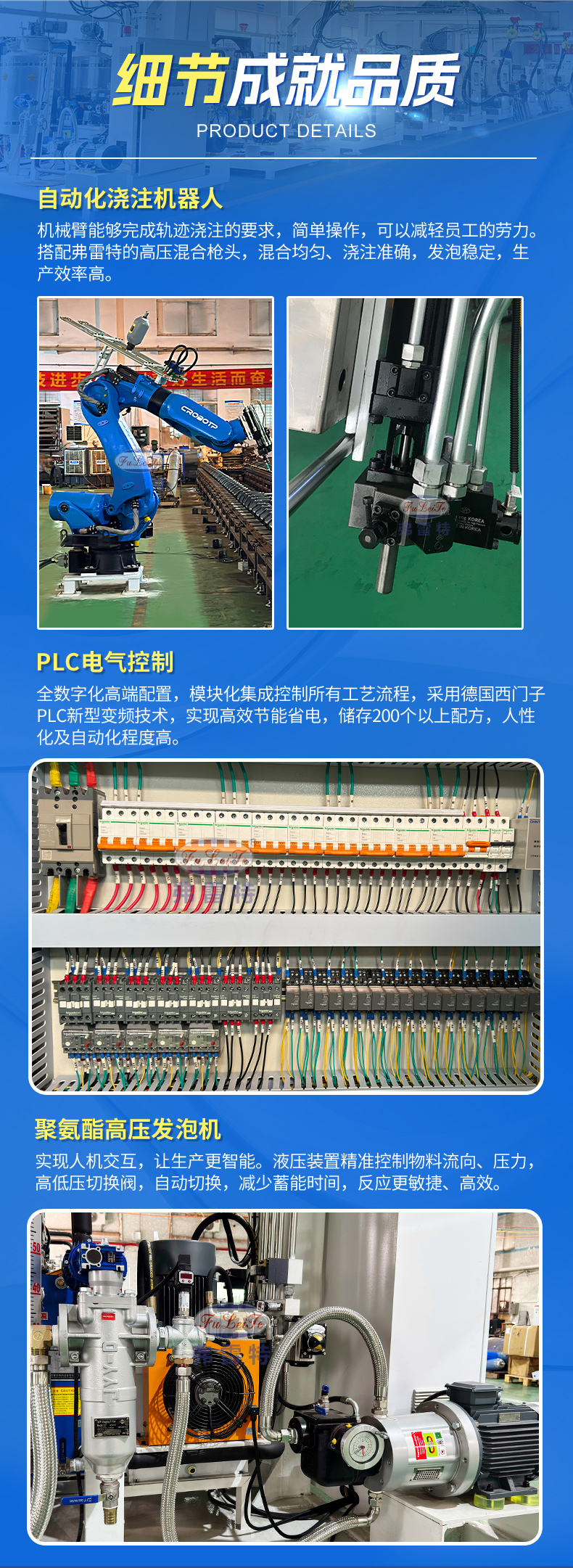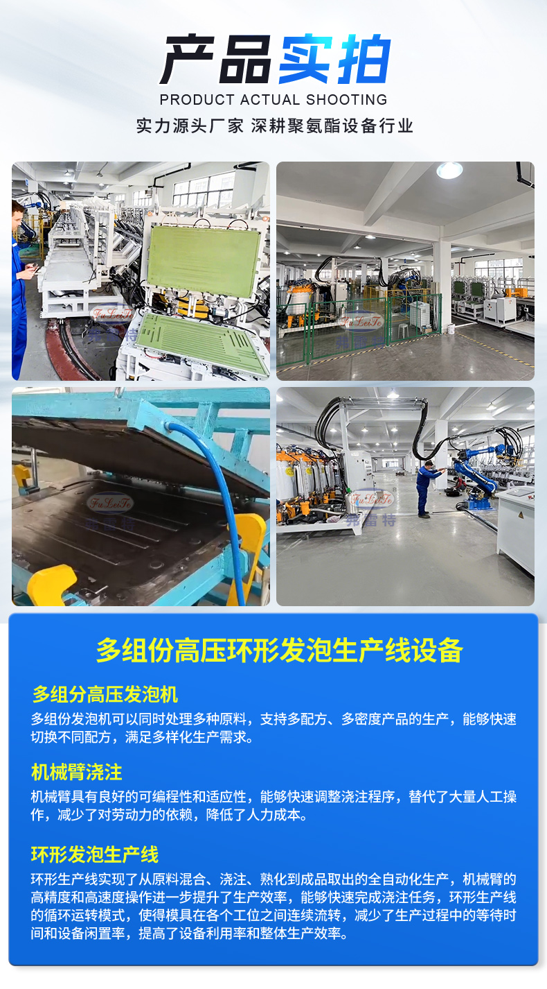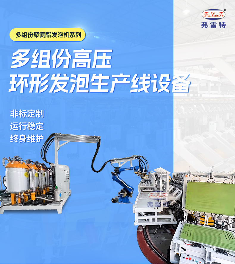弗雷特聚氨酯多組份高壓發泡機,高壓槍頭自動澆注,氣動模架自動開合,節省人力,操作更為方便。整套發泡生產線由弗雷特制造,我們致力于為客戶提供完整的聚氨酯設備配套方案。